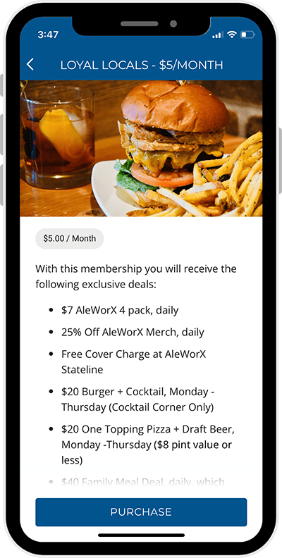 Lake Tahoe AleworX has three taprooms near some of the best ski slopes in the world. Business booms on the weekends, but used to slow during the week. But now for just $5/month locals can unlock a special menu Monday - Thursday that includes a $20 burger + cocktail, $20 pizza + beer, or $40 family feast! Turns out it pays to keep the locals happy and well fed!