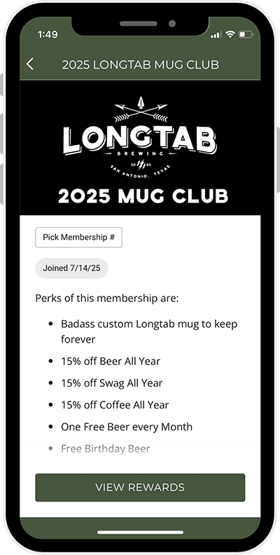 Longtab is a veteran owned brewery in San Antonio, TX with strong community ties. Each year they commission 200 totally badass custom mugs. Members carry their mugs like badges of honor. They also get 1 free beer each month, 15% off always, two member parties, plus a handful of other perks.